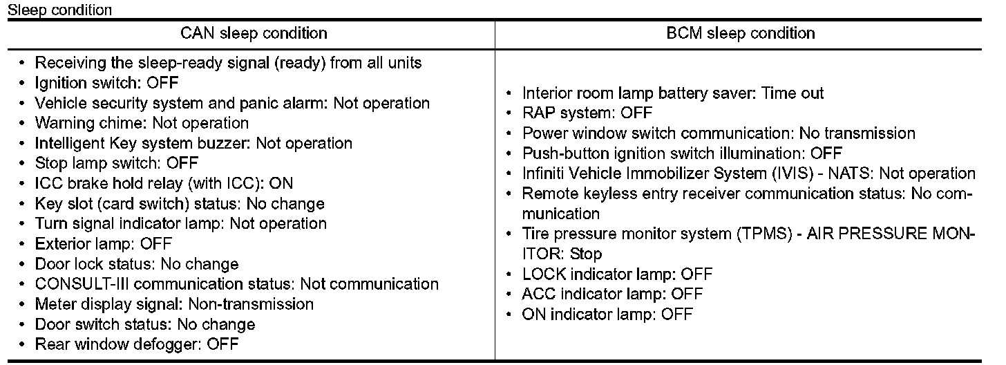 - BCM transmits the sleep wake up signal (sleep) to each unit when all of the CAN sleep conditions are fulfilled.
