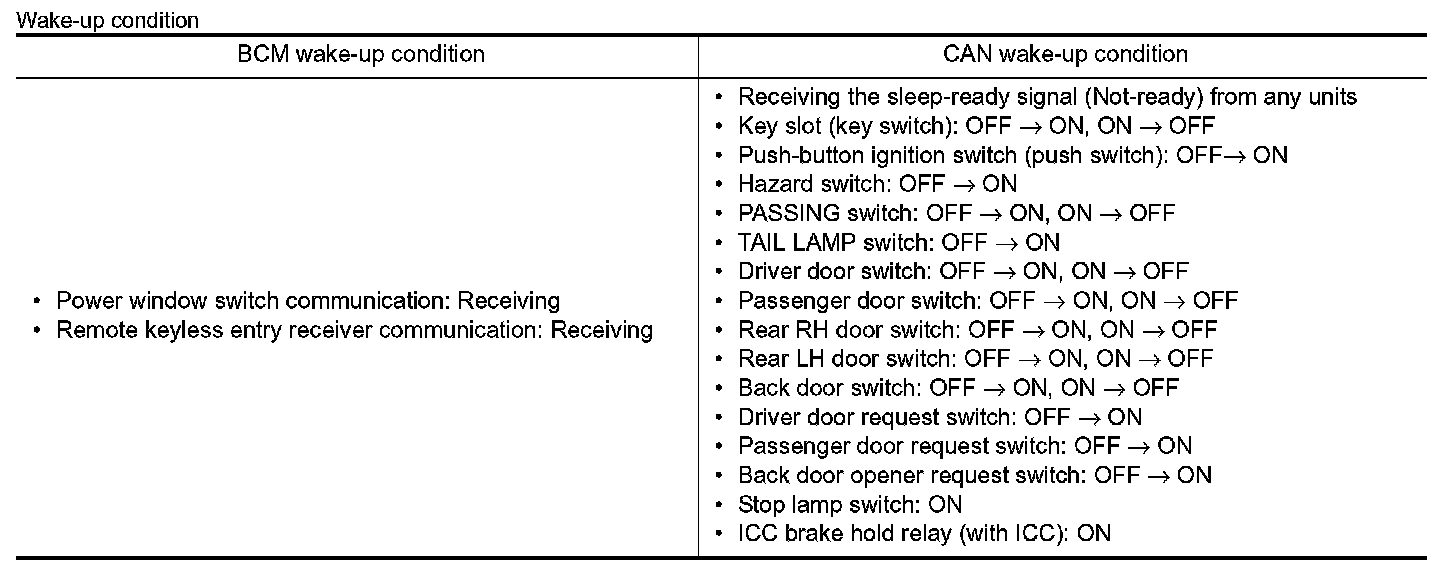 - BCM transmits the sleep wake up signal (wake up) to each unit when any of the CAN wake-up conditions is fulfilled. It changes from the low power consumption mode or the CAN communication sleep mode to the normal mode.