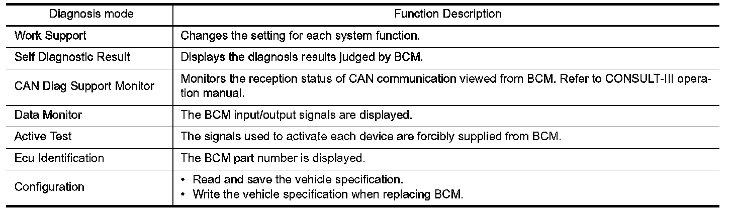CONSULT-III performs the following functions via CAN communication with BCM.