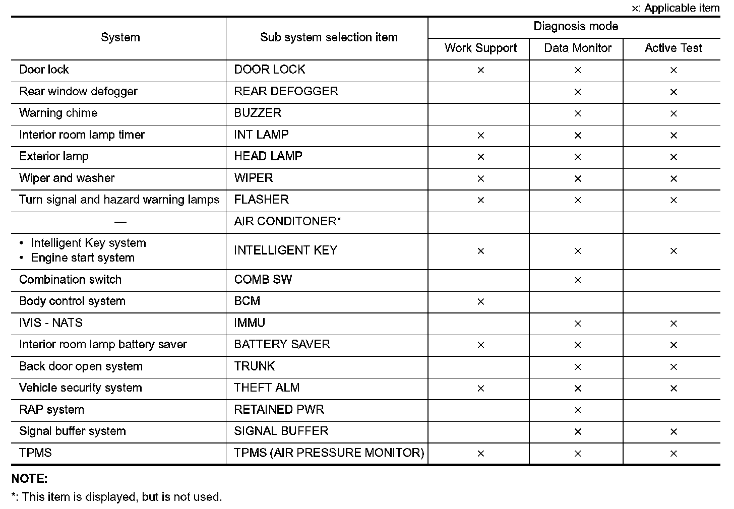 It can perform the diagnosis modes except the following for all sub system selection items.
