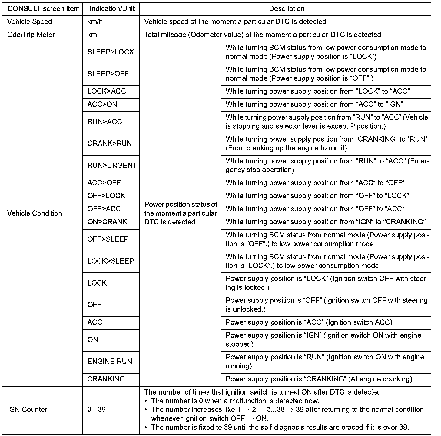 The BCM records the following vehicle condition at the time a particular DTC is detected, and displays on