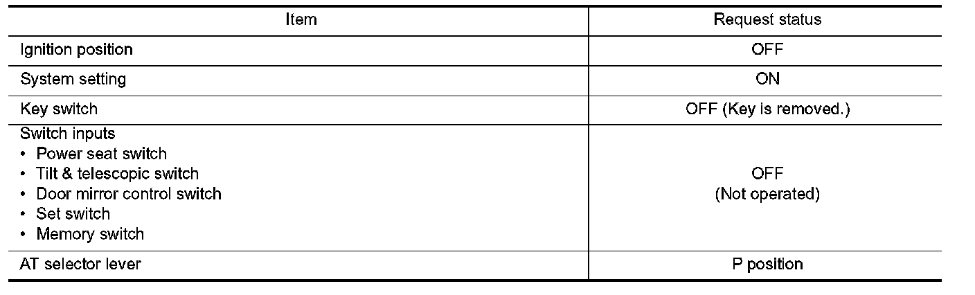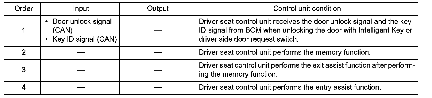 When unlocking doors by using Intelligent Key or driver side door request switch, the system performs memory operation, exiting operation then entry operation.