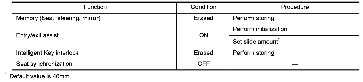 Each function is reset to the following condition when the battery terminal is disconnected.