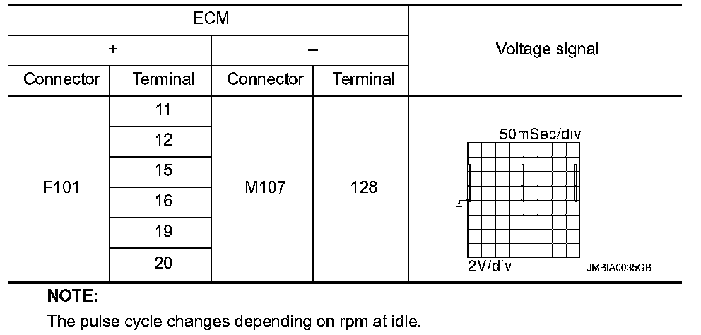 2. Read the voltage signal between ECM harness connector terminals under the following conditions with an oscilloscope.