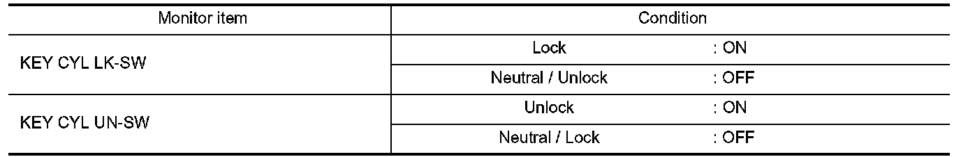 Check ("KEY CYL LK-SW", "KEY CYL UN-SW") in "DATA MONITOR" mode for "POWER DOOR LOCK SYSTEM" with CONSULT-III. CONSULT-III Function (BCM - Door Lock).