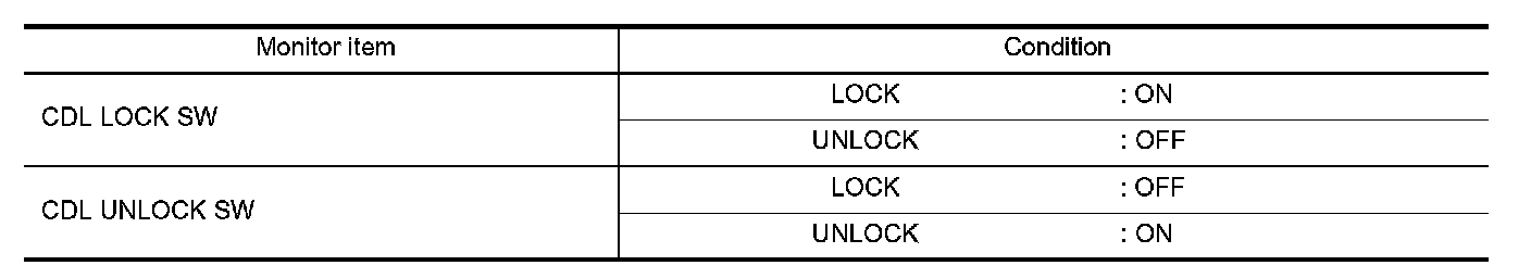 Check ("CDL LOCK SW ", "CDL UNLOCK SW") in "DATA MONITOR" mode for "POWER DOOR LOCK SYSTEM" with CONSULT-III. CONSULT-III Function (BCM - Door Lock).