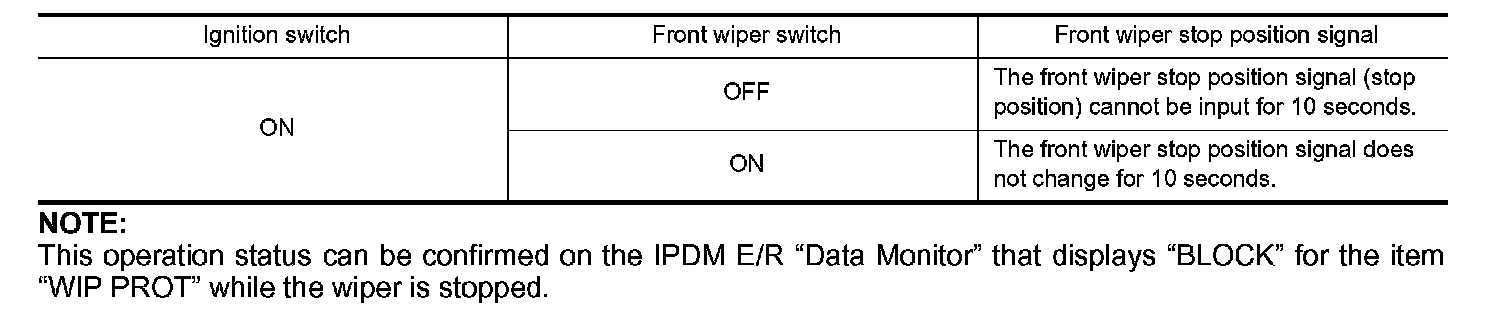 When a front wiper stop position signal is in the conditions listed below, IPDM E/R stops power supply to wiper after repeating a front wiper 10 seconds activation and 20 seconds stop five times.
