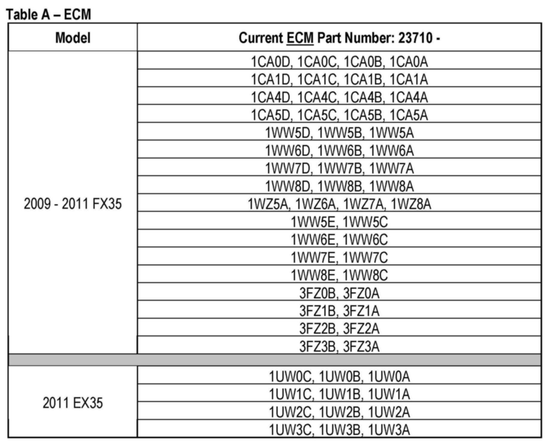 B. Compare the P/Ns you wrote down to the numbers in the Current ECM Part Number column in Table A above, and Current TCM Part Number column in Table B above.
