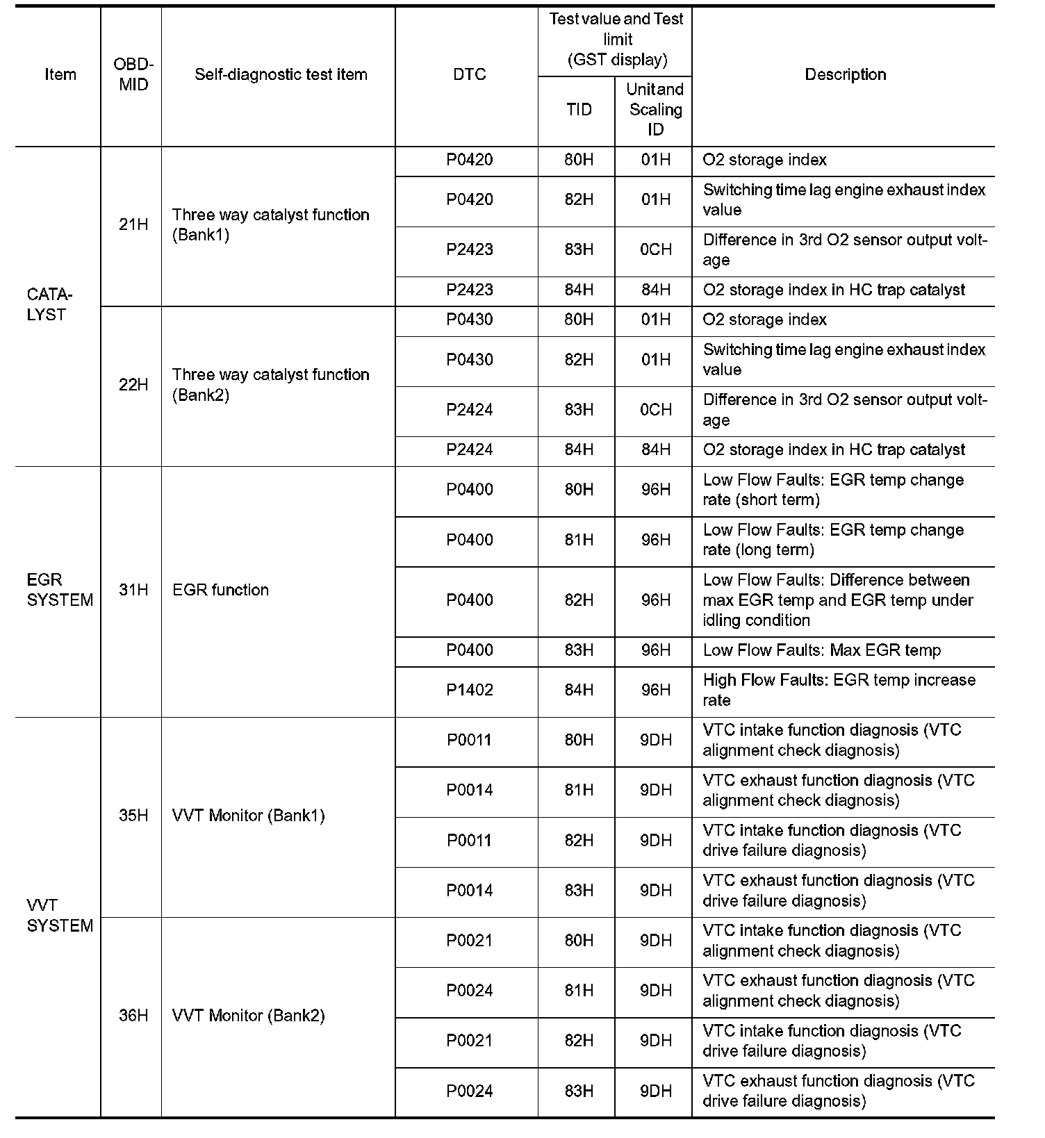 The items of the test value and test limit will be displayed with GST screen which items are provided by the ECM. (e.g., if bank 2 is not applied on this vehicle, only the items of bank 1 are displayed)
