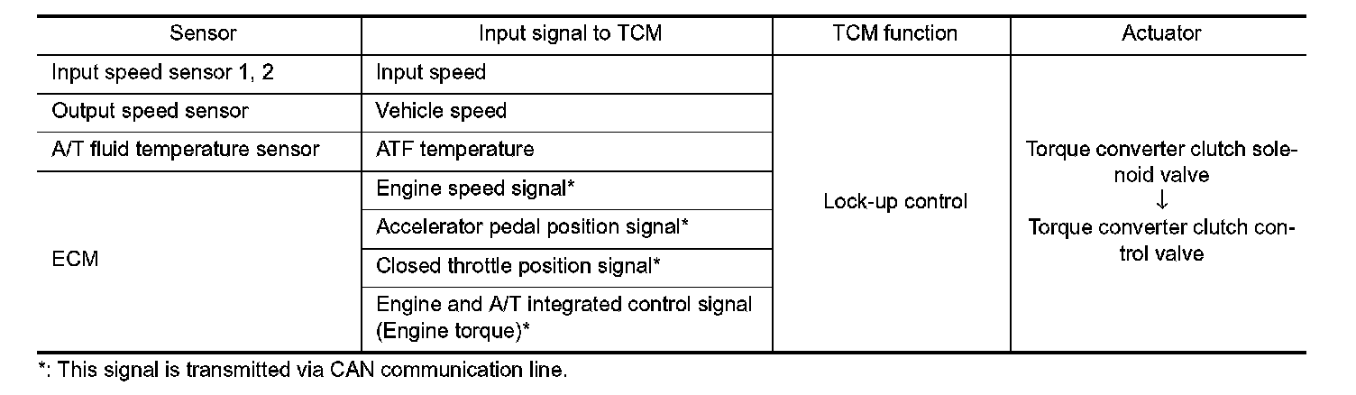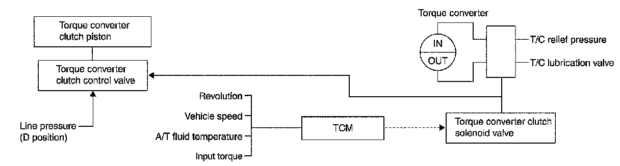 The torque converter clutch control valve operation is controlled by the torque converter clutch solenoid valve, which is controlled by a signal from TCM, and the torque converter clutch control valve engages or releases the torque converter clutch piston.