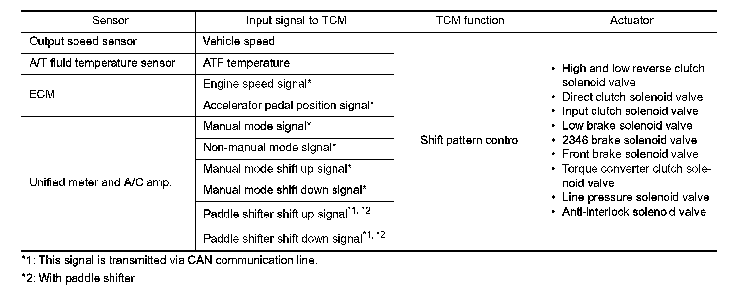 - The TCM receives the manual mode signal, non-manual mode signal, manual mode shift up signal, manual mode shift down signal, paddle shifter shift up signal* and paddle shifter shift down signal* from unified meter and A/C amp. via CAN communication line. The TCM shifts shift pattern control to the manual mode based on these signals, and then shifts the A/T by operating each solenoid valve according to the shift operation of the driver.