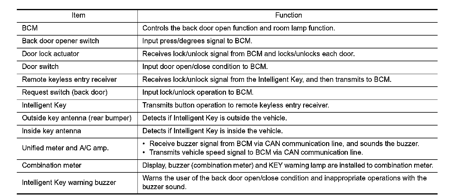 BACK DOOR OPEN FUNCTION : Component Description