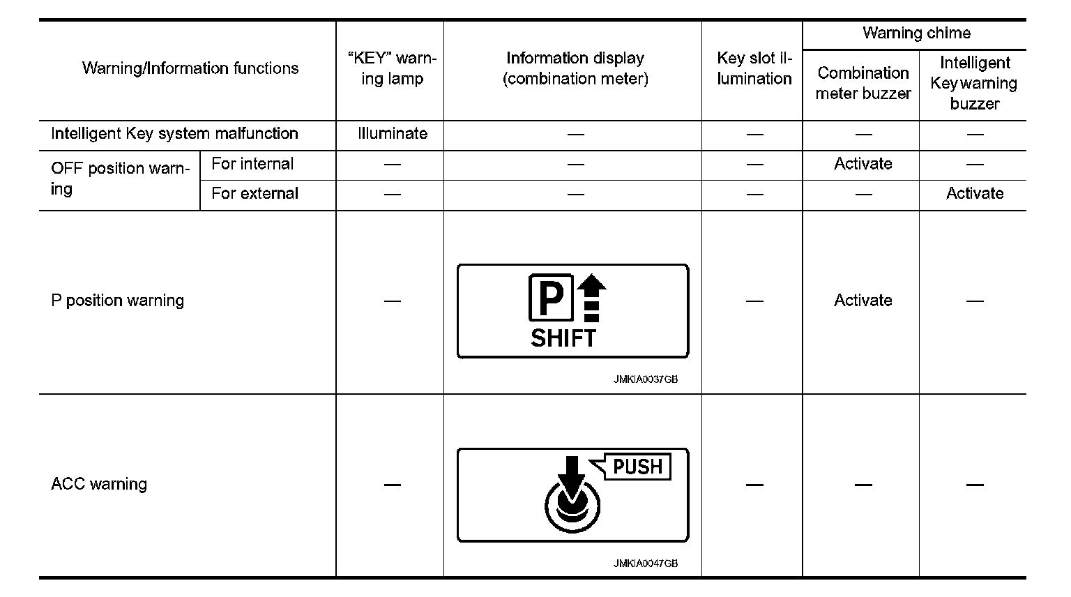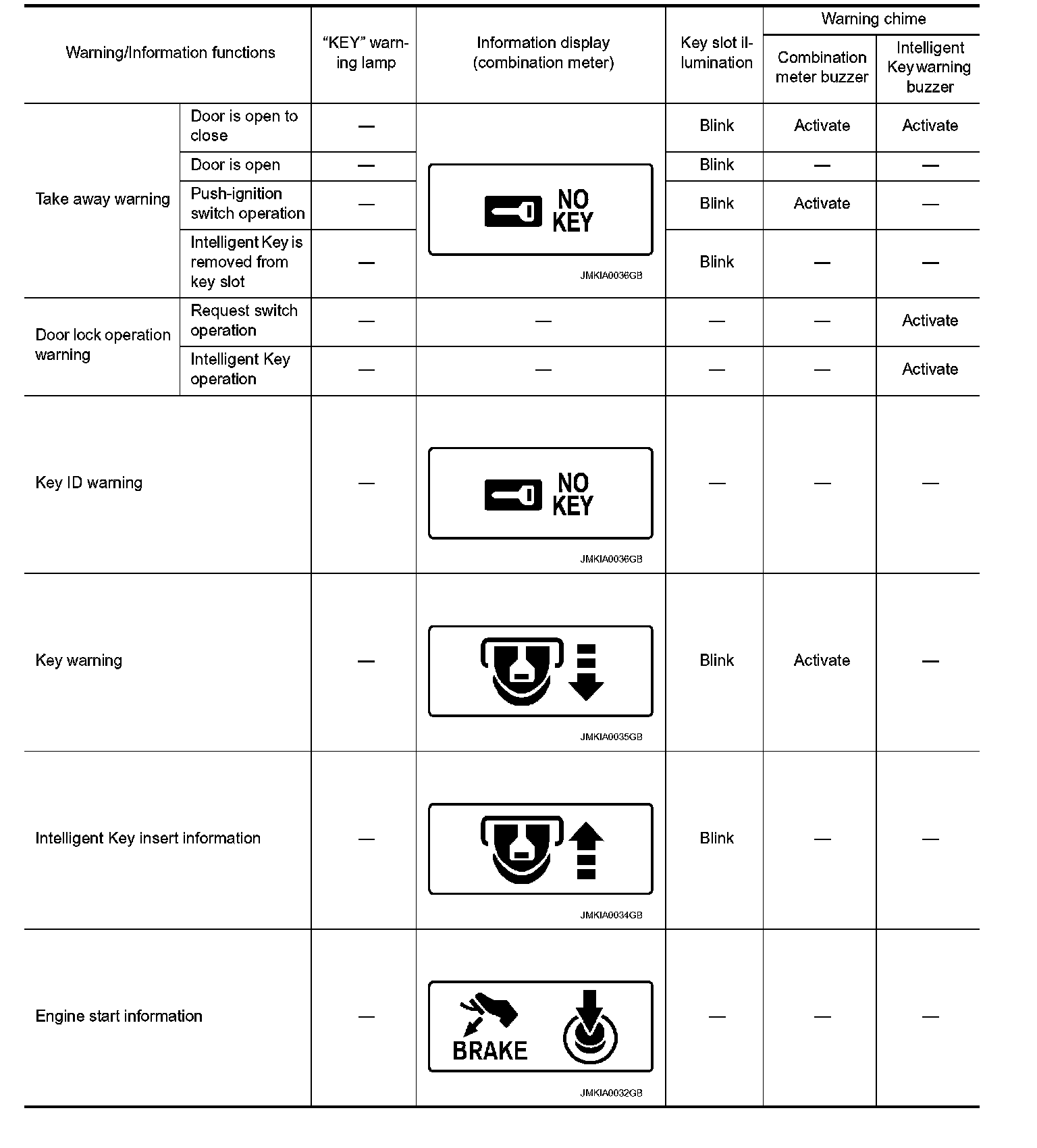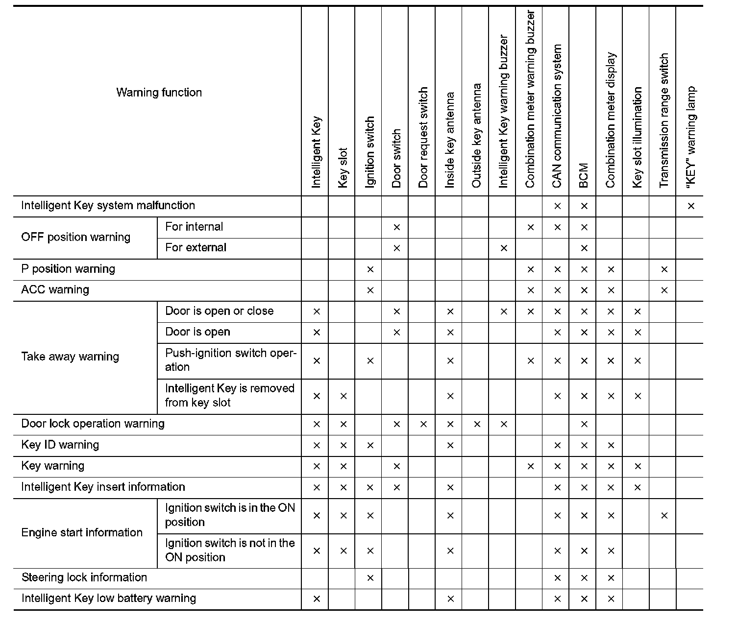 The warning functions are as per the following and are given to the user as warning information and warnings using combinations of Intelligent Key warning buzzer, KEY warning lamp, key slot illumination and information displayed on combination meter.