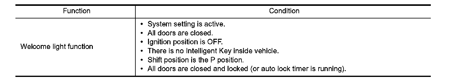 Setting of welcome light function can be changed by the following procedure. (For system setting by CONSULT-III: CONSULT-III Function (BCM - Intelligent Key).)