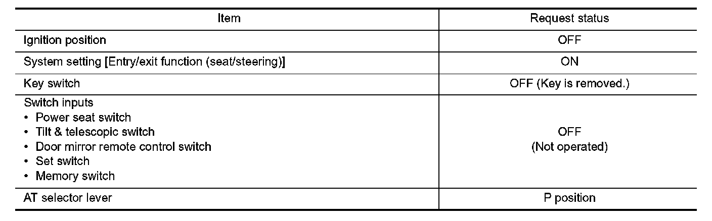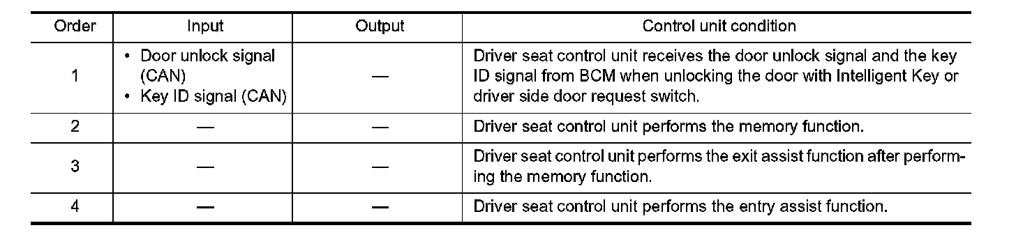 When unlocking doors by using Intelligent Key or driver side door request switch, the system performs memory operation, exiting operation then entry operation.