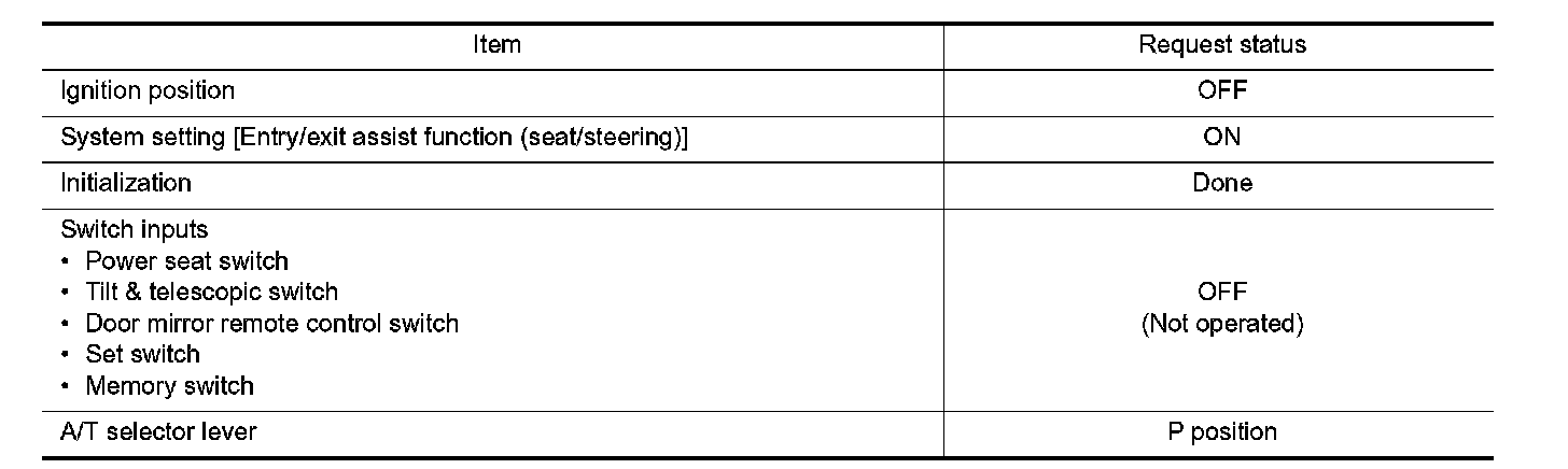 When exiting, the condition is satisfied, the seat is moved backward 40 mm (1.57 in) from normal sitting position and the steering is moved to the most upper position and front position.