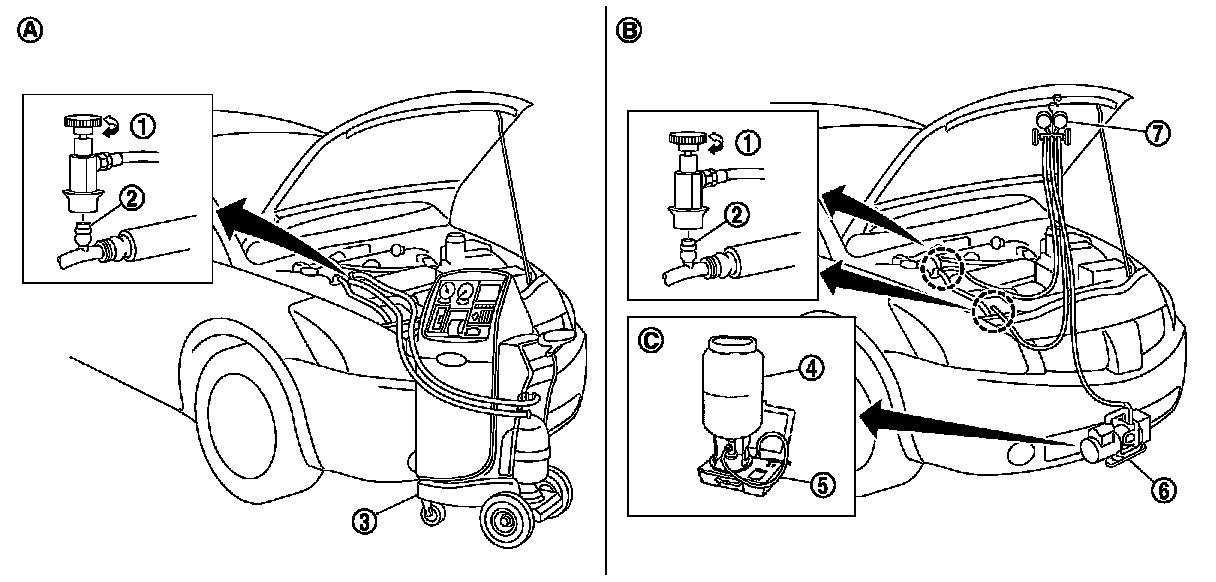 1. Connect refrigerant recovery/recycling recharging equipment or manifold gauge set (SST: J-39183).