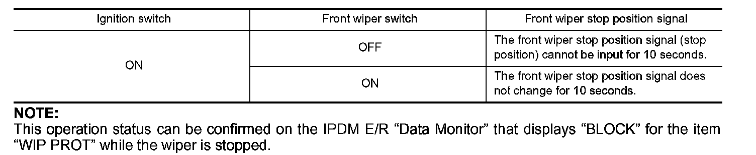 When a front wiper stop position signal is in the conditions listed below, IPDM E/R stops power supply to wiper after repeating a front wiper 10 seconds activation and 20 seconds stop five times.