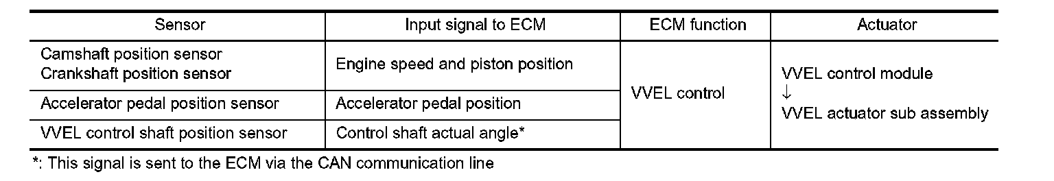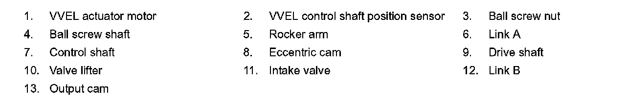 VVEL (Variable Valve Event & Lift) is a system that controls valve event and valve lift continuously. Rotational movement of the drive shaft equipped with eccentric cam is transmitted to output cam via the rocker arm and two kinds of links to depress the intake valve. ECM decides the target valve lift according to the driving condition and sends the command signal to the VVEL control module. The VVEL control module controls the rotation of the control shaft using the VVEL actuator motor and changes the movement of the output cam by shifting the link supporting point. As a result, valve lift changes continuously to improve engine output and response.