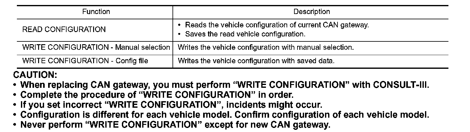 - When replacing CAN gateway, you must perform "WRITE CONFIGURATION" with CONSULT-III.