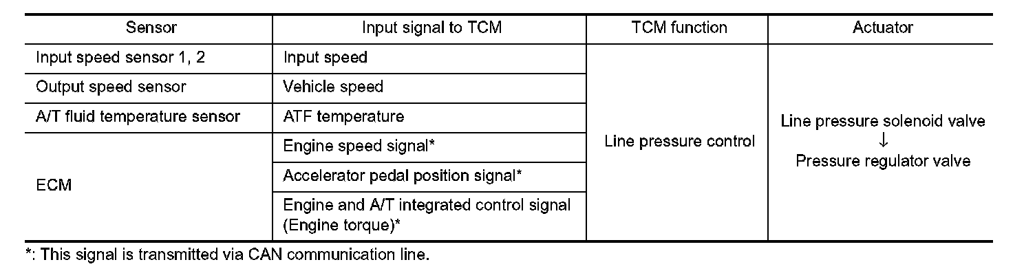 - When an engine and A/T integrated control signal (engine torque) equivalent to the engine drive force is transmitted from the ECM to the TCM, the TCM controls the line pressure solenoid valve.