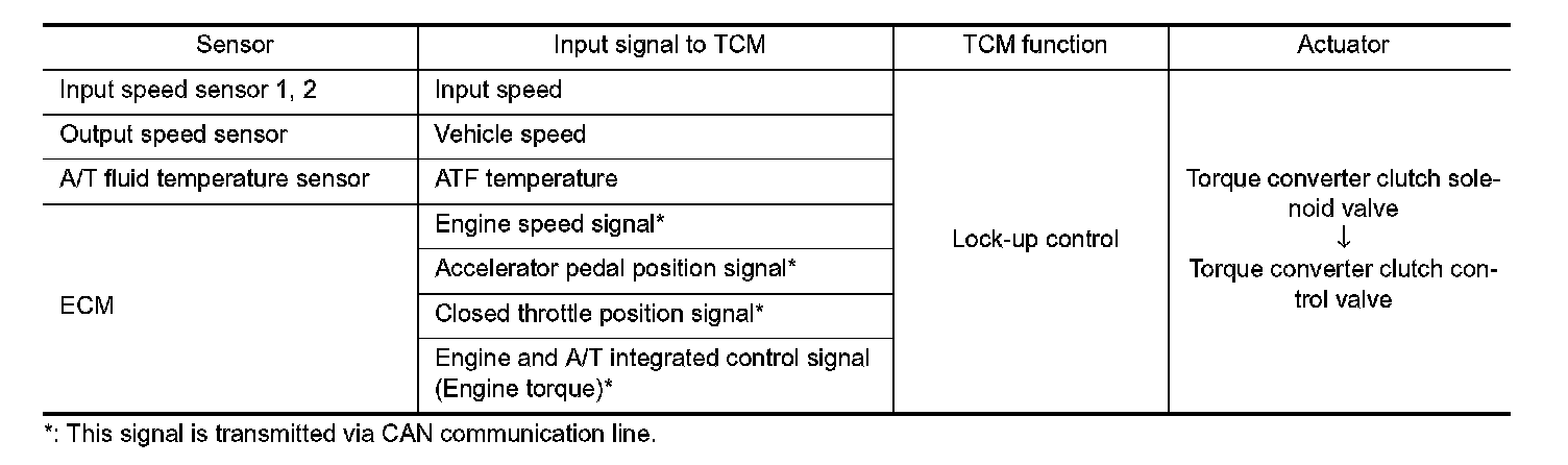 The torque converter clutch control valve operation is controlled by the torque converter clutch solenoid valve, which is controlled by a signal from TCM, and the torque converter clutch control valve engages or releases the torque converter clutch piston.