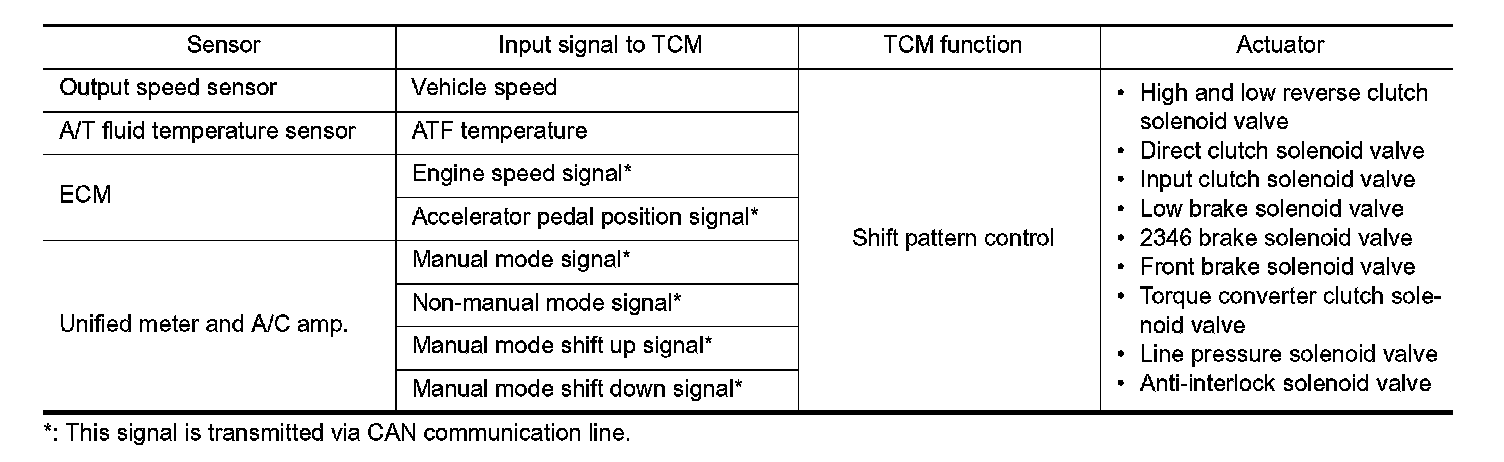 - The TCM receives the manual mode signal, non-manual mode signal, manual mode shift up signal and manual mode shift down signal from unified meter and A/C amp. via CAN communication line. The TCM shifts shift pattern control to the manual mode based on these signals, and then shifts the A/T by operating each solenoid valve according to the shift operation of the driver.
