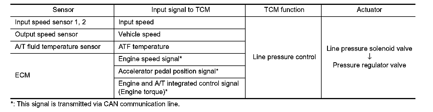 - When an engine and A/T integrated control signal (engine torque) equivalent to the engine drive force is transmitted from the ECM to the TCM, the TCM controls the line pressure solenoid valve.