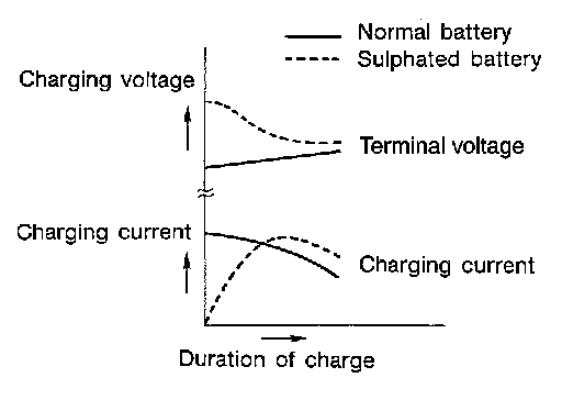 To determine if a battery has been "sulphated", note its voltage and current when charging it. As shown in the figure, less current and higher voltage are observed in the initial stage of charging sulphated batteries.