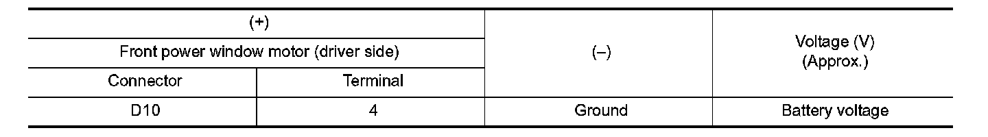 3. Check voltage between front power window motor (driver side) harness connector and ground.