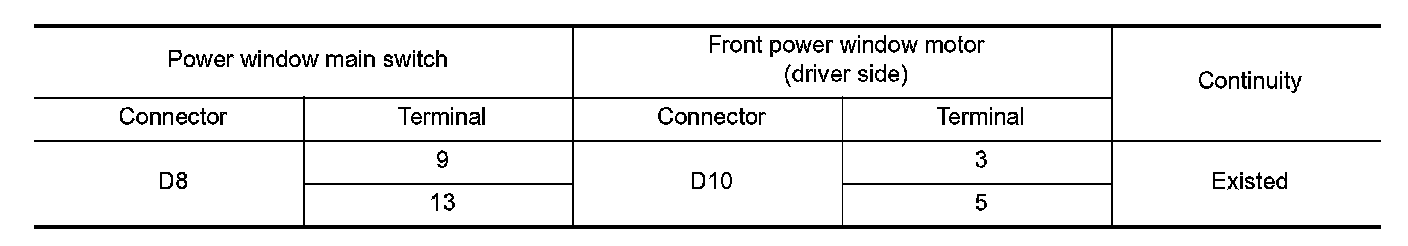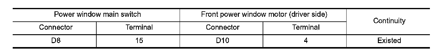 2. Check continuity between power window main switch harness connector and front power window motor