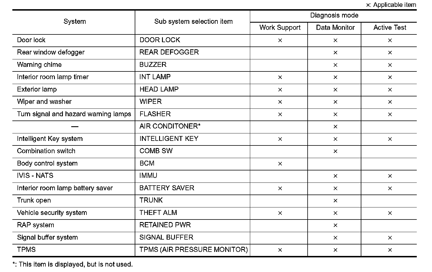 It can perform the diagnosis modes except the following for all sub system selection items.