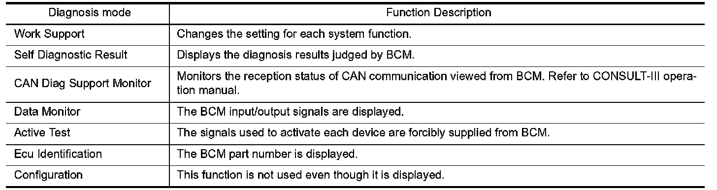 CONSULT-III performs the following functions via CAN communication with BCM.