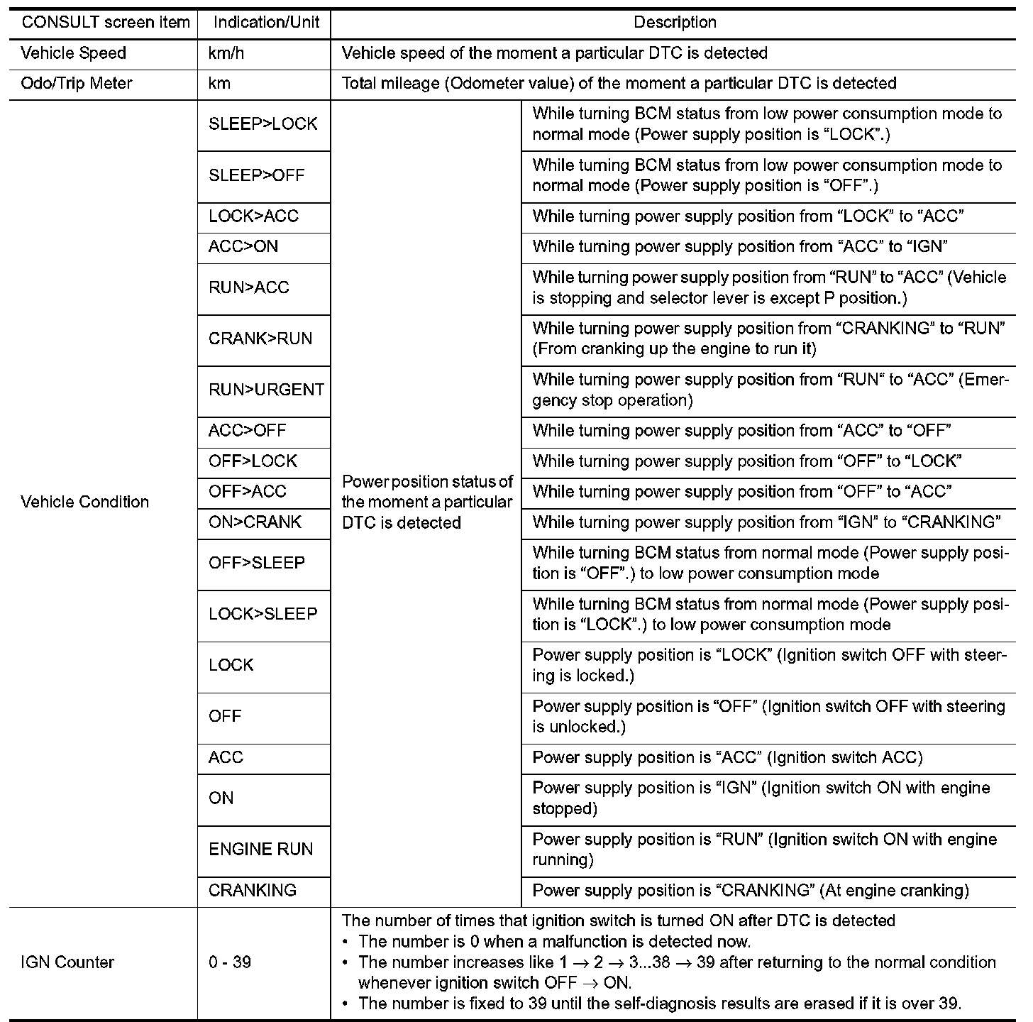 The BCM records the following vehicle condition at the time a particular DTC is detected, and displays on