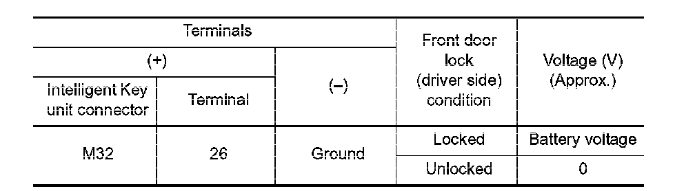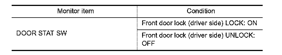 Check unlock sensor ("DOOR STAT SW") in "DATA MONITOR" mode.