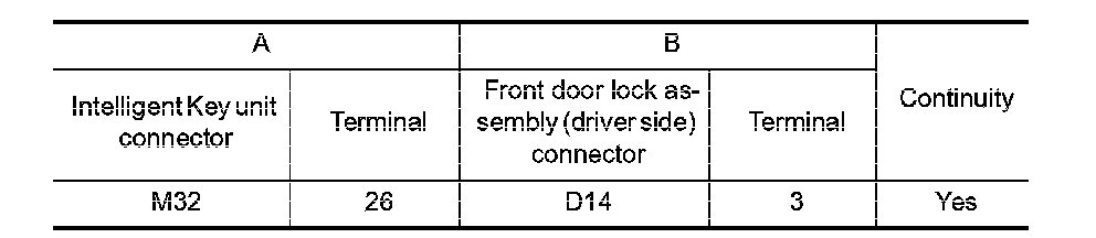 3. Check continuity between Intelligent Key unit connector and front door lock assembly (driver side) connector.