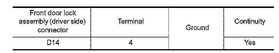 Check continuity between front door lock assembly (driver side) connector and ground.