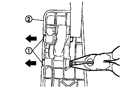 4. Press the pin (1) with long-nose pliers and pull them out in the direction shown by the arrow ( ). Then remove the accelerator pedal pad (2).
