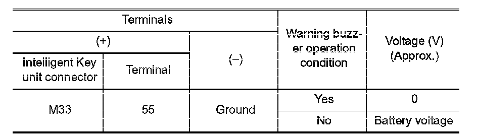 NG - Repair or replace harness between Intelligent Key unit and Intelligent Key warning buzzer.