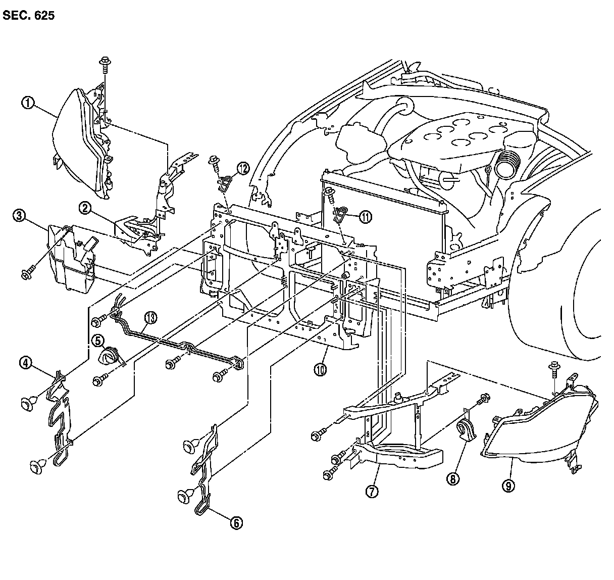 3. Remove headlamp (LH/RH). Removal and Installation (FOR USA) or Lighting and Horns (FOR CANADA).