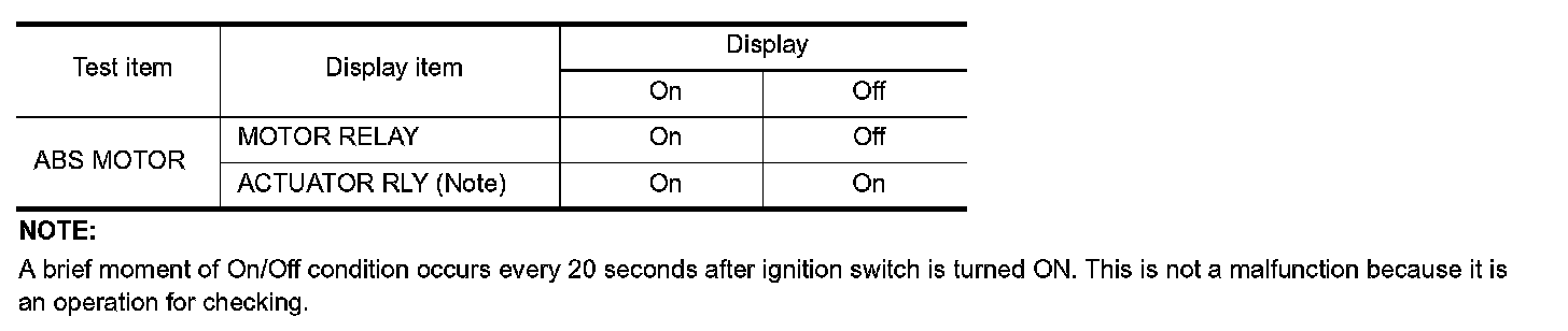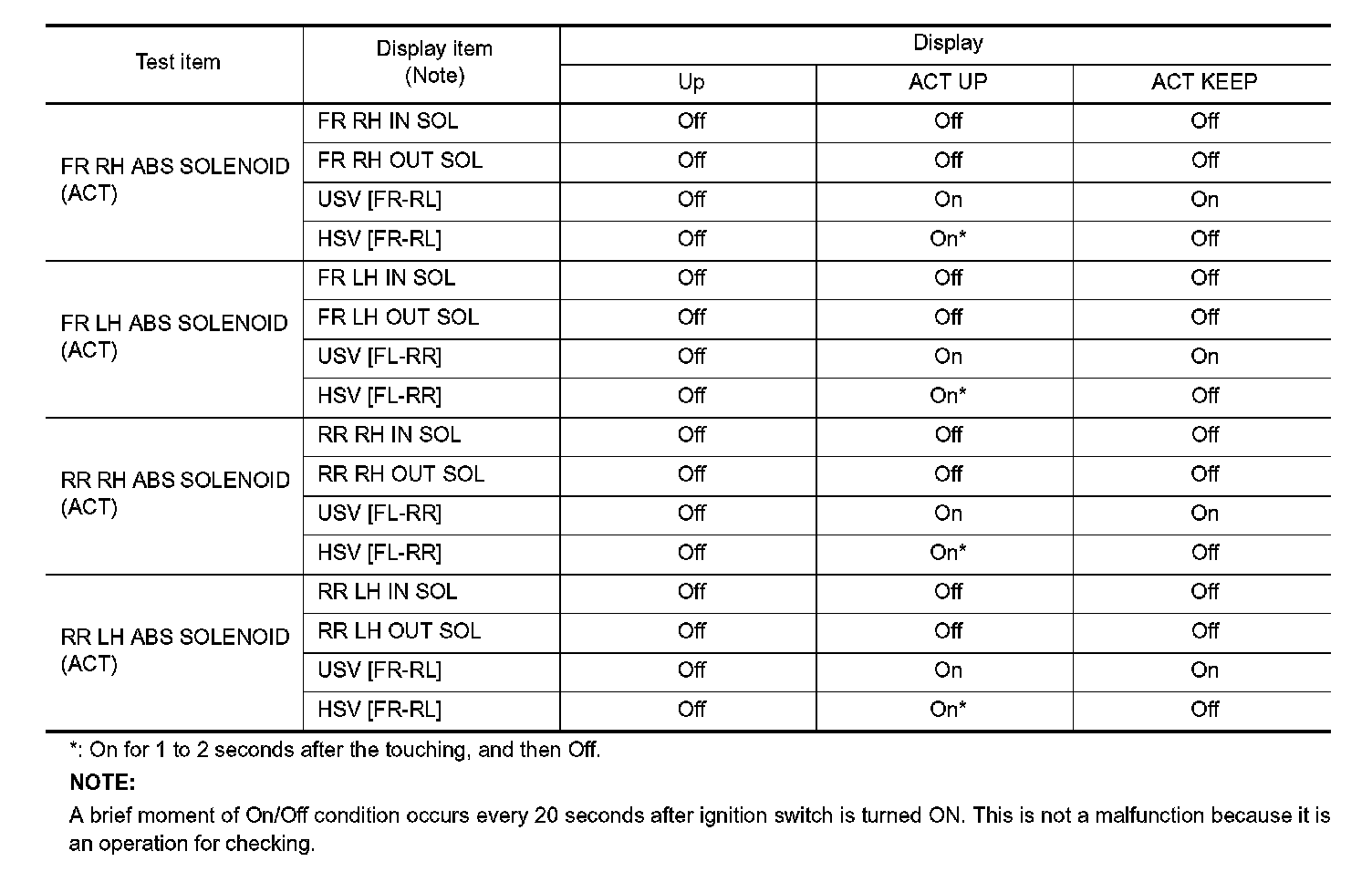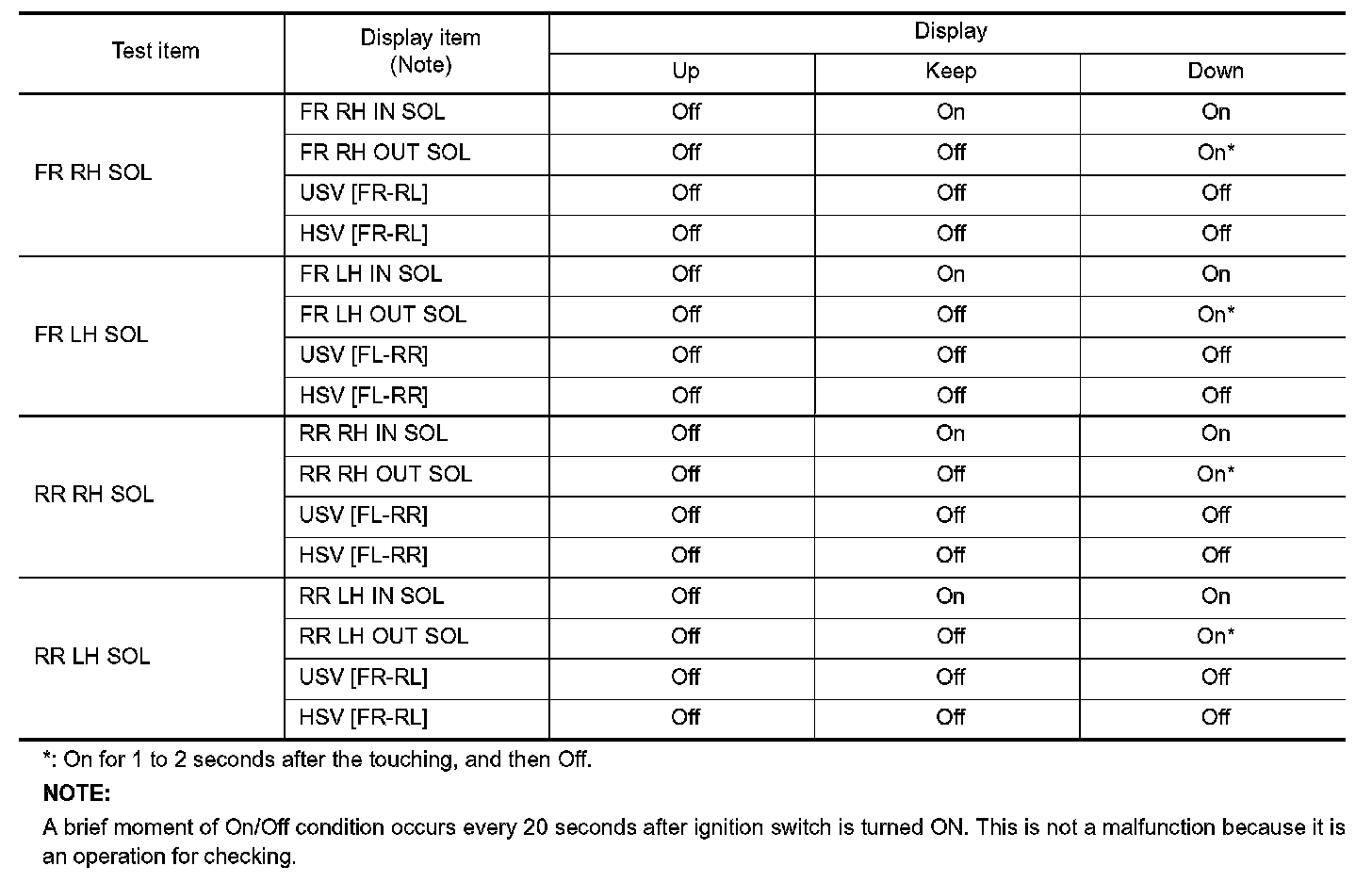 - When active test is performed while depressing the pedal, the pedal depression amount will change. This is normal. (Only solenoid valve and ABS motor.)
