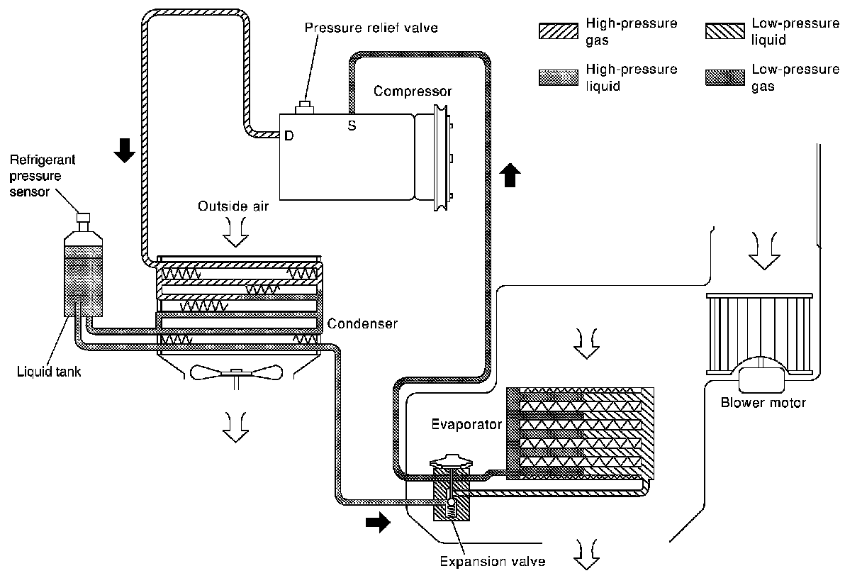 The refrigerant system is protected against excessively high- or low-pressures by the refrigerant pressure sensor, located on the liquid tank. If the system pressure rises above, or falls below the specifications, the refrigerant pressure sensor detects the pressure inside the refrigerant line and sends the voltage signal to the ECM.