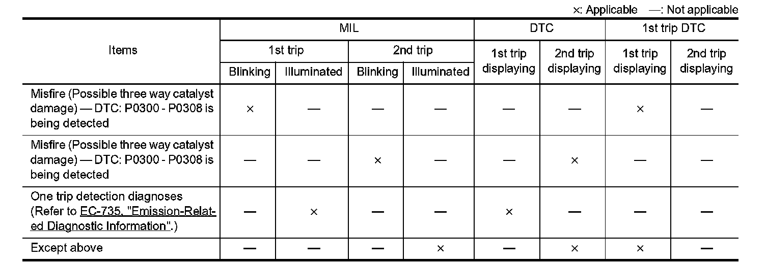 The "trip" in the "Two Trip Detection Logic" means a driving mode in which self-diagnosis is performed during vehicle operation. Specific on board diagnostic items will cause the ECM to illuminate or blink the MIL, and store DTC and Freeze Frame data, even in the 1st trip, as shown below.