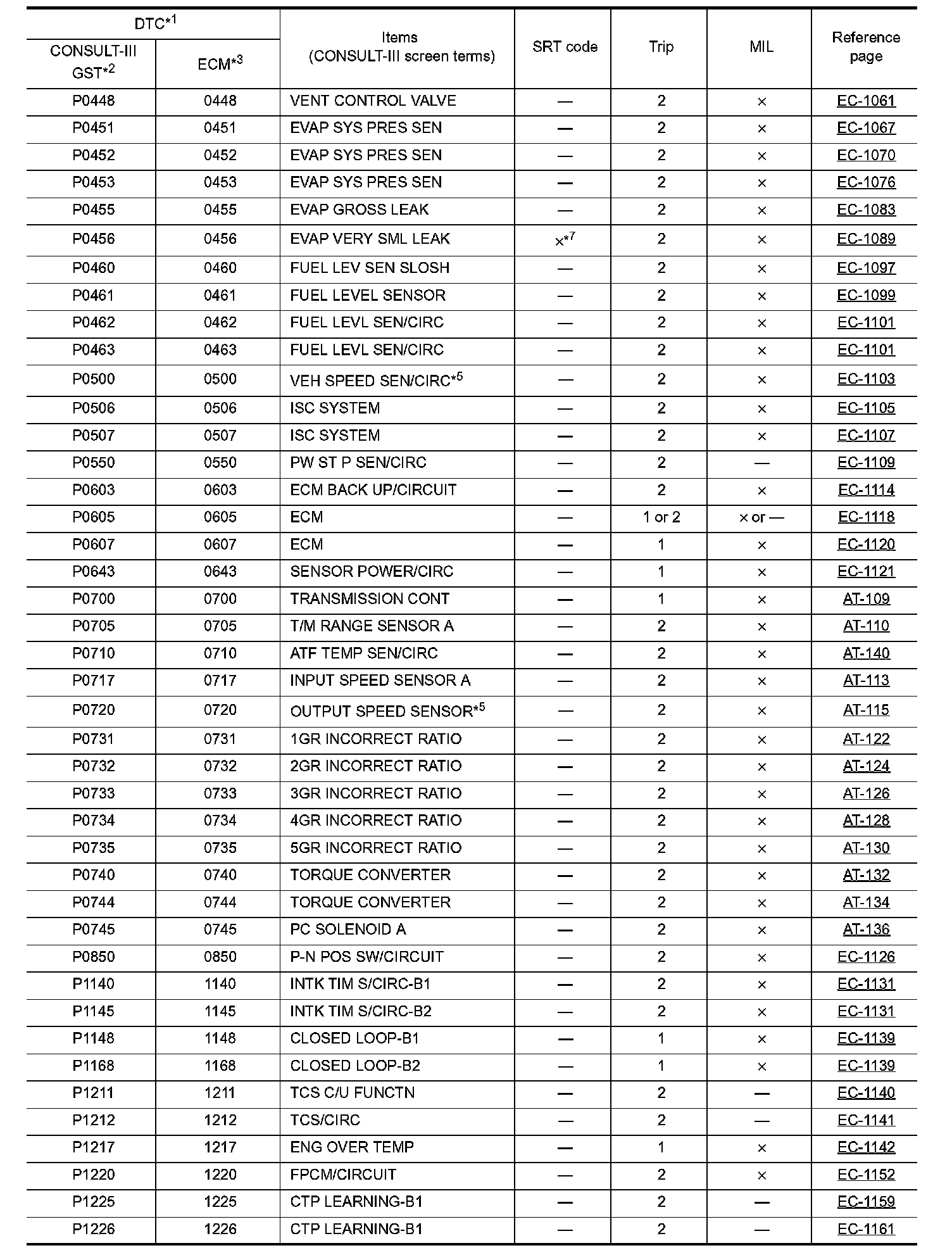 For malfunctions in which 1st trip DTCs are displayed, refer to "EMISSION-RELATED DIAGNOSTIC INFORMATION ITEMS". These items are required by legal regulations to continuously monitor the system/component. In addition, the items monitored non-continuously are also displayed on CONSULT-III.