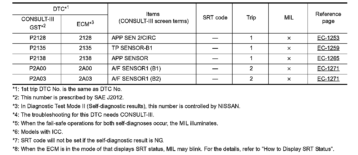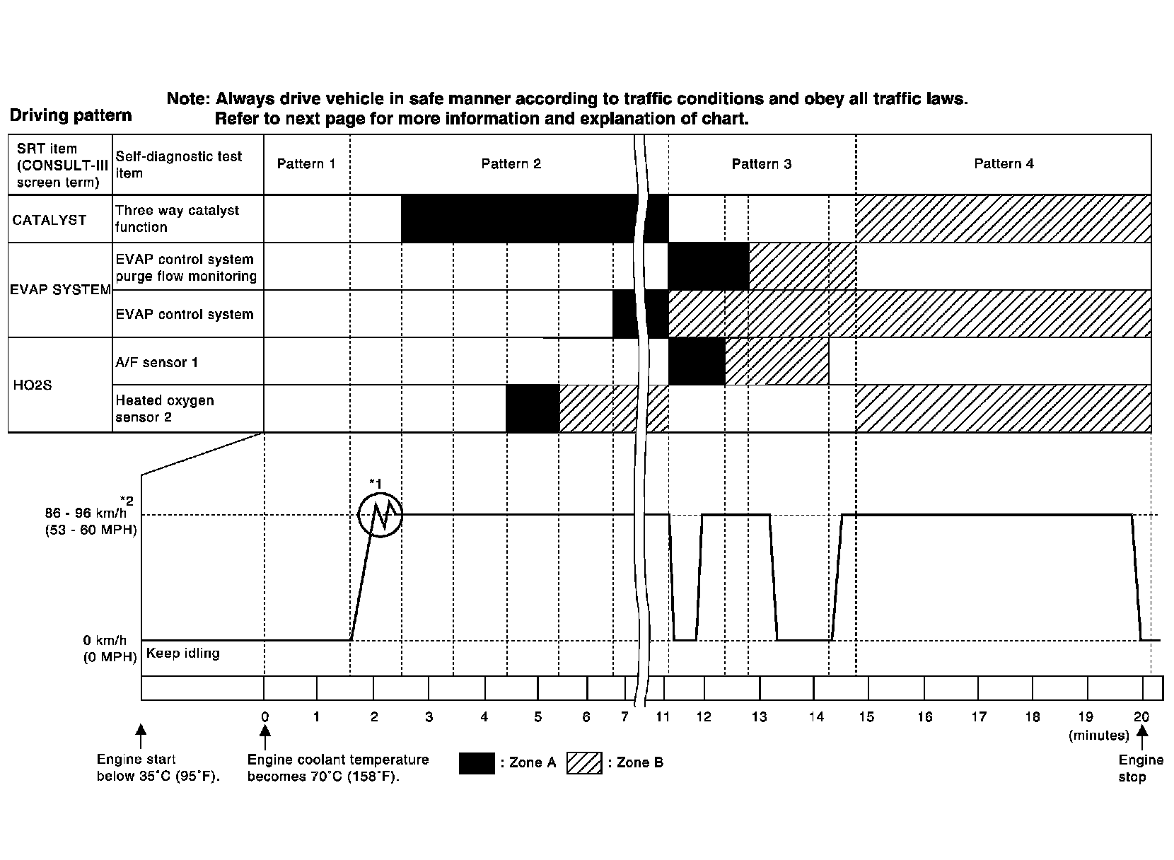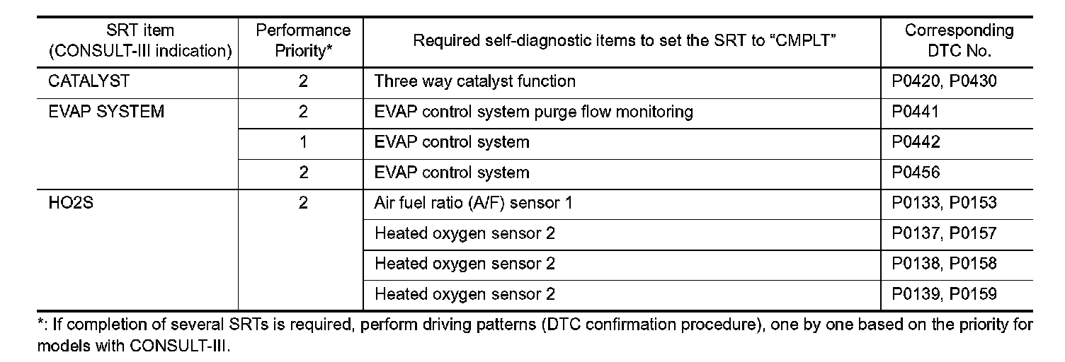 To set all SRT codes, self-diagnosis for the items indicated above must be performed one or more times. Each diagnosis may require a long period of actual driving under various conditions.