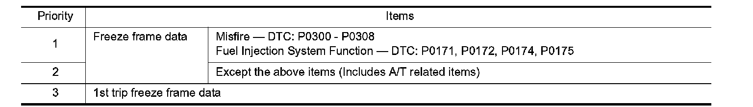 For example, the EGR malfunction (Priority: 2) was detected and the freeze frame data was stored in the 2nd trip. After that when the misfire (Priority: 1) is detected in another trip, the freeze frame data will be updated from the EGR malfunction to the misfire. The 1st trip freeze frame data is updated each time a different malfunction is detected. There is no priority for 1st trip freeze frame data. However, once freeze frame data is stored in the ECM memory, 1st trip freeze data is no longer stored (because only one freeze frame data or 1st trip freeze frame data can be stored in the ECM). If freeze frame data is stored in the ECM memory and freeze frame data with the same priority occurs later, the first (original) freeze frame data remains unchanged in the ECM memory.
