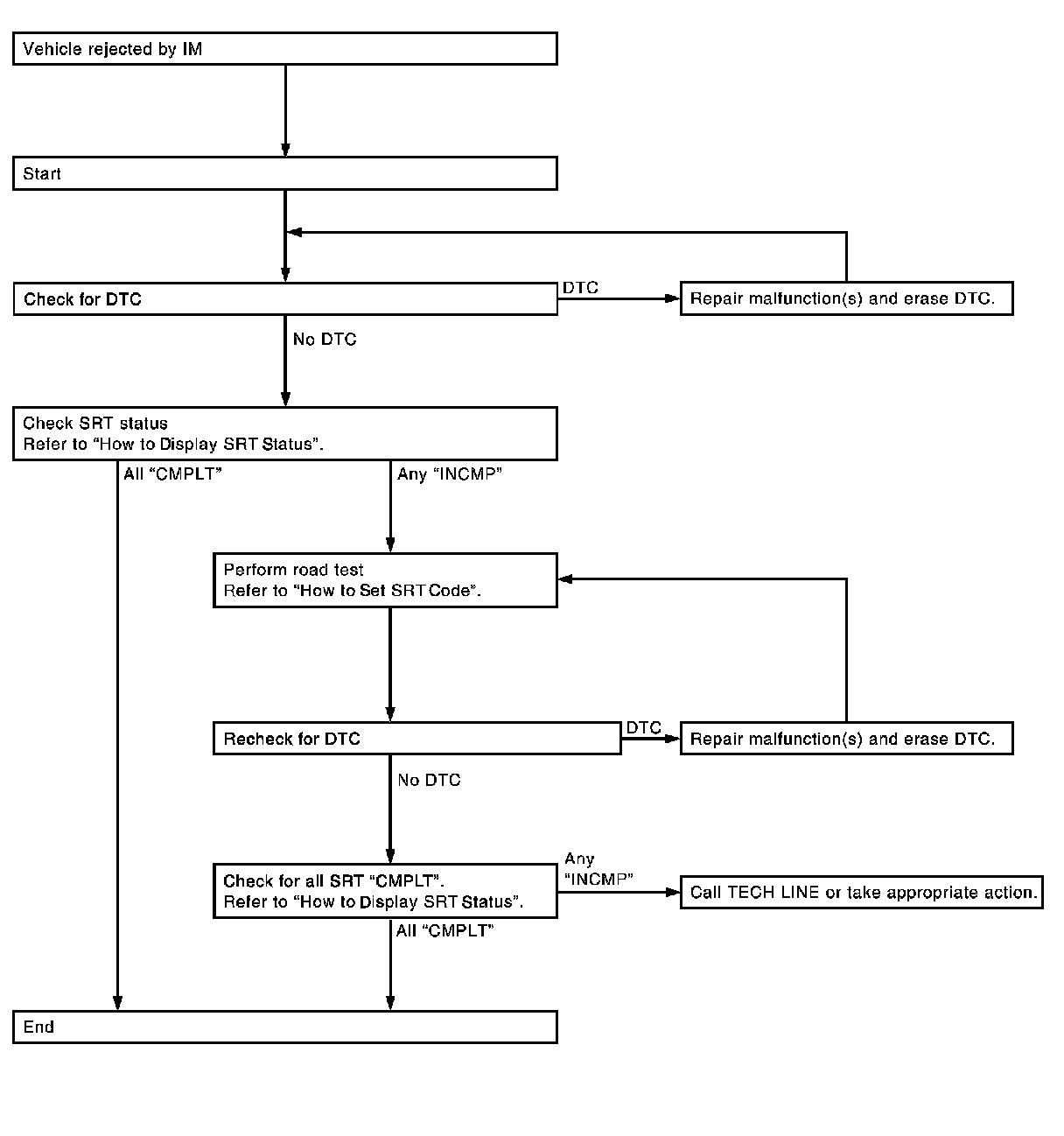 If a vehicle is rejected for a State emissions inspection due to one or more SRT items indicating "INCMP", use the information in this Service Manual to set the SRT to "CMPLT".