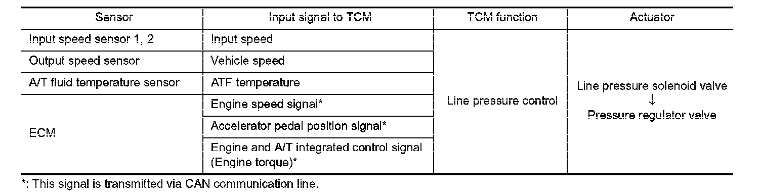 - When an engine and A/T integrated control signal (engine torque) equivalent to the engine drive force is transmitted from the ECM to the TCM, the TCM controls the line pressure solenoid valve.