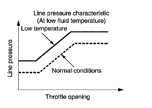 When the A/T fluid temperature drops below the prescribed temperature, in order to speed up the action of each friction element, the line pressure is set higher than the normal line pressure characteristic.