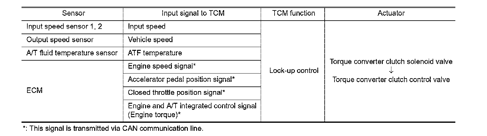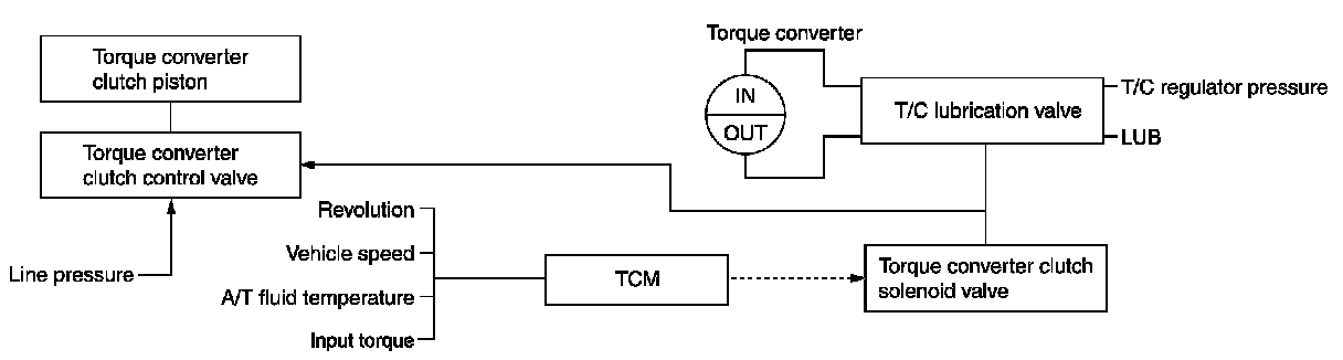 The torque converter clutch control valve operation is controlled by the torque converter clutch solenoid valve, which is controlled by a signal from TCM, and the torque converter clutch control valve engages or releases the torque converter clutch piston.